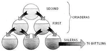 During the aging, an intricate blending process unique to Sherries is carried out. Called soleras y criaderas , it consists of running the wine through a stack of butts containing wines of increasing ages. From the oldest, called the solera , one-third of the wine is drawn off for bottling. It is replenished from the next-oldest (the first criadera ), which in turn is replenished from the next-oldest, (the second criadera ), and so on, until the youngest wine butts at the top of the stack are “refreshed,” or filled, with brand-new pressings. ( Criadera comes from the Spanish word for nursery; the criaderas are the upper butts in which the younger wines are nurtured. Solera refers to the stone floor, where the bottom layer of butts holds the mature wine ready for bottling.)