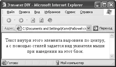 Текст внутри этого элемента выровнен по центру, а с помощью стилей задается вид указателя мыши при наведении на этот блок.