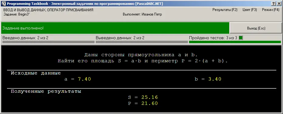Поздравляем! Задание Begin3 под руководством электронного задачника выполнено! Результаты выполнения заданий можно просмотреть, щелкнув мышью на метке Результаты (F2)", расположенной в правом верхнем углу окна задачника, или нажав клавишу F2. После закрытия окна задачника и возврата в среду PascalABC.NET результаты можно отобразить на экране, нажав кнопку