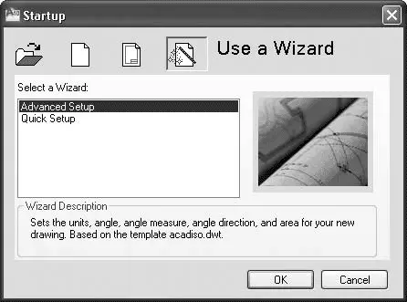 • Последняя кнопка – Use a Wizard(Использовать мастер). Она вызывает мастер создания чертежа, с помощью которого вы сами можете настроить параметры нового документа. Мастер может работать в двух режимах: Advanced Setup(Детальная подготовка) и Quick Setup(Быстрая подготовка). При выборе первого способа настраивается большее количество параметров.