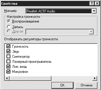 Убедитесь, что в показанном на рис. 2.19 окне при установленном переключателе Воспроизведениев списке Отображать регуляторы громкостиустановлен флажок Лин. вход. При нажатии кнопки OKрегуляторы будут показаны, и можно будет провести описанную выше настройку уровней громкости.