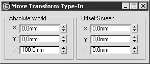 на панели инструментов и в области Absolute:World(Абсолютные: глобальные) открывшегося окна Move Transform Type-In(Ввод данных преобразования перемещения) задайте параметру Zзначение, равное 100 (рис. 4.1).