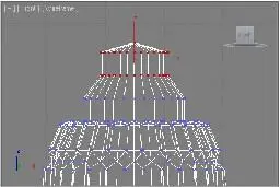 21. Перейдите на уровень редактирования подобъекта Vertex (Вершина) и выдели-те в окне проекций Front (Вид спереди) три верхних блока вершин (самый верхний "блок" состоит из одной лишь вершины, остальные — из нескольких, рис. 2.154).