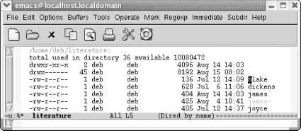 Emacs starts up editing the directory literature : you'll see a single window that contains a listing of the literature directory. You can also start the directory editor by using C-x C-f(or any other command for visiting a file) and naming a directory, rather than a file. For example, typing C-x C-f literaturegets you ready to edit the literature directory. Typing C-x d(for dired) or selecting the folder icon on the toolbar also starts Dired; you then specify a directory name. Finally, dragging a folder onto the Emacs window also starts Dired. [26]