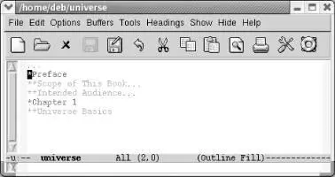 To start outline mode, type M-x outline-mode Enter. Outlineappears on the mode line. (Outline mode is also available as a minor mode; we'll discuss that later in this section.)