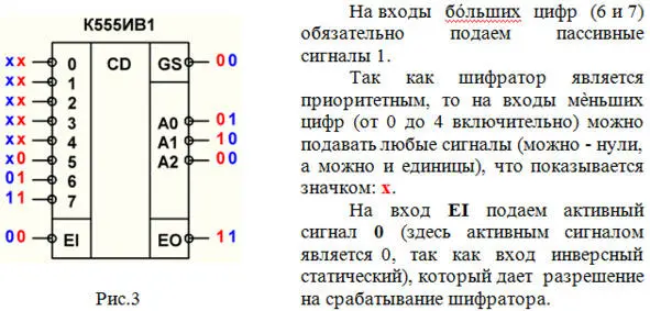 Примечание: Подробное описание решения такой задачи приведено в Примере из §3.3 [Л1]. Еще следует учесть, что микросхема К555ИВ1 выполняет преобразование десятичных цифр от 0 до 7 включительно в 3-разрядный двоичный код.