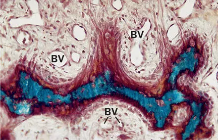 Fig 2-1Light microscopic view of woven bone. This type of bone forms struts and ridges, which are always closely associated with blood vessels (BV) (Goldner trichrome stain).