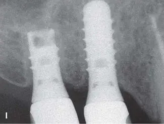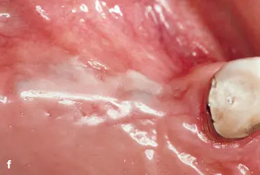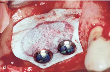 Early on, several complications were observed with both approaches, and modifications of the surgical techniques were proposed to improve the predictability of successful treatment outcomes. One frequent complication was the collapse of the ePTFE membranes, which reduced the volume of the regenerated tissue underneath the membrane. In addition, some of the regenerated sites demonstrated insufficient bone formation and the formation of a periosteum-like tissue underneath the membrane. 37 , 40 Therefore, bone fillers such as autografts or allografts were recommended by various groups, primarily to support the membrane and reduce the risk of membrane collapse. 54 – 56 The combination of ePTFE membranes and autogenous bone grafts provided good clinical outcomes for both approaches. Some of these patients are still being followed and documented up to 25 years after surgery (Figs 1-2 to 1-4).