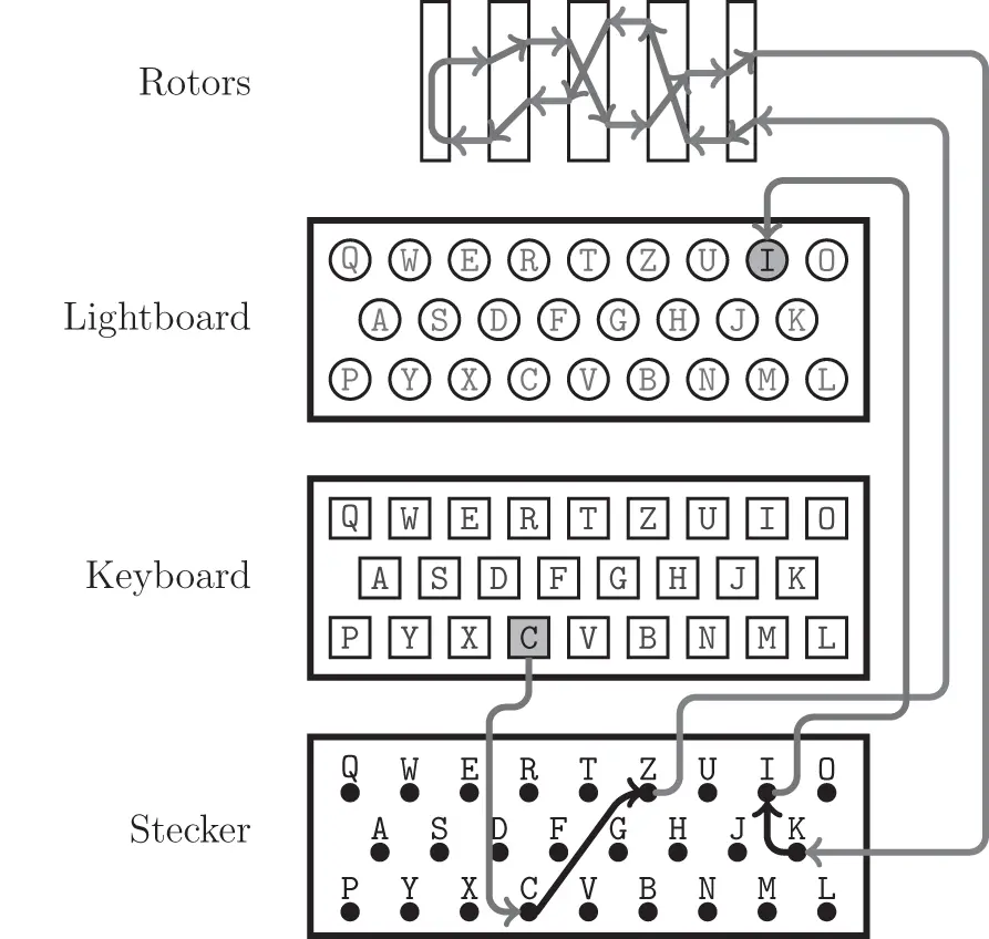 An illustration of the “wiring diagram″ for the Enigma cipher appears in Figure 2.5. Additional details on the inner workings of the Enigma are given in the problems at the end of this chapter and a cryptanalytic attack is presented in the cryptanalysis material available on the textbook website.