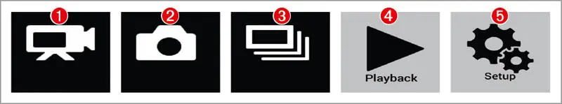 Bei eingeschalteter Kamera navigieren Sie mit der Ein-/Modus-Taste durch das Hauptmenü. Die drei Aufnahmemodi sind Video, Foto und Multi-Shot. Zusätzlich gibt es einen Wiedergabemodus und einen Menüpunkt für allgemeine Kameraeinstellungen .