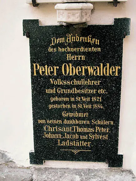 Schüler widmeten ihrem Lehrer Peter Oberwalder den Grabstein an der Kirchmauer von St. Veit. Diesem außergewöhnlichen Pädagogen bewahrte Reimmichl lebenslang ein dankbares Gedenken.