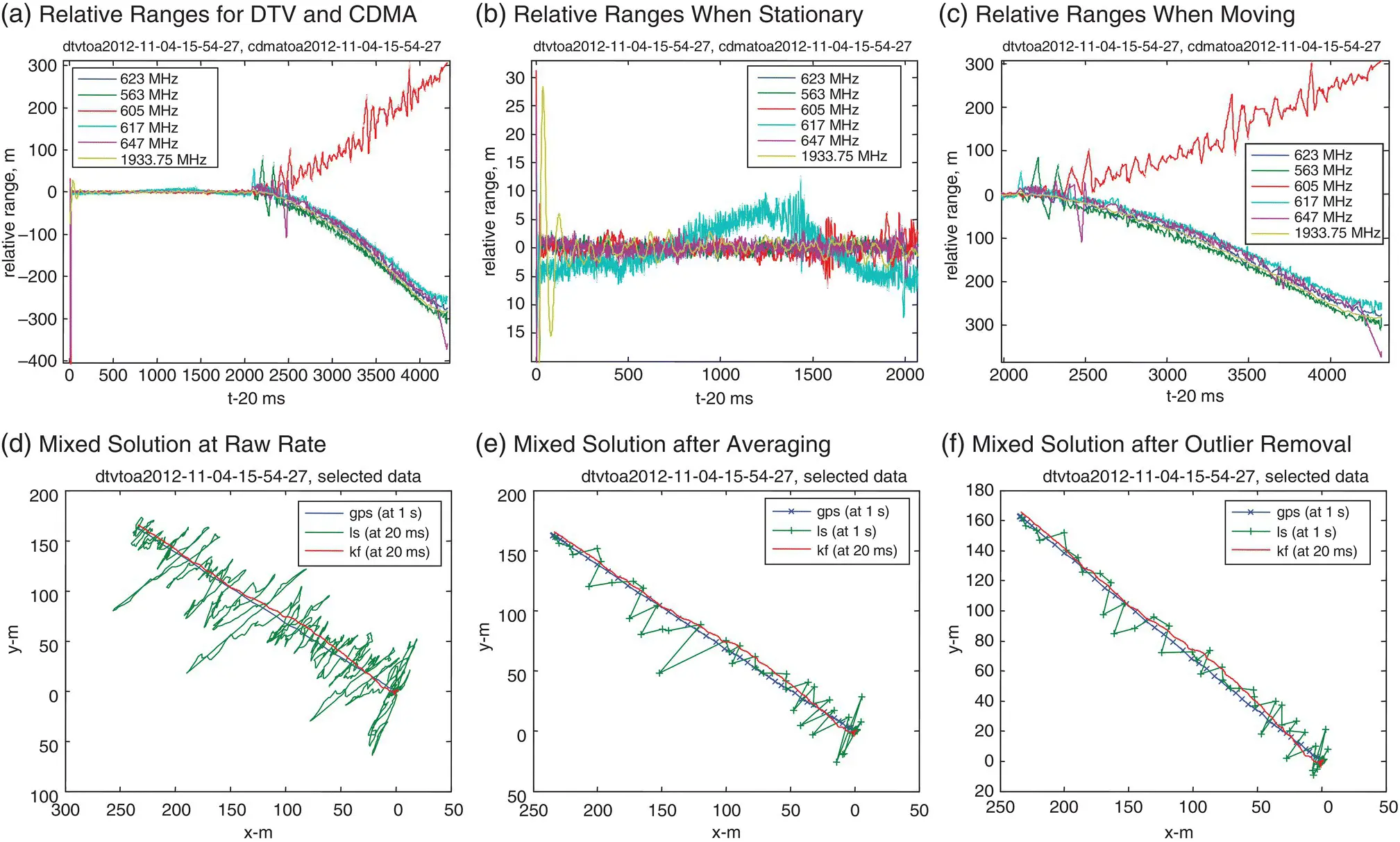Figure 40.23(a) shows the relative ranges to the DTV and CDMA sources. The vehicle was stationary for the first 40 s and then moving about 300 m in 50 s (at a speed of 15 mph on average). As shown in Figure 40.23(b), the initial transients settled after 0.5 s for the DTV channels and after 3 s for the CDMA channel. Except for the DTV channel at 617 MHz, which exhibits large variations (−5 to 10 m), the others are small (±2 m). In fact, the standard deviations during the stationary period are 0.78, 0.88, 1.67, 4.13, 1.15, and 1.49 m, respectively.