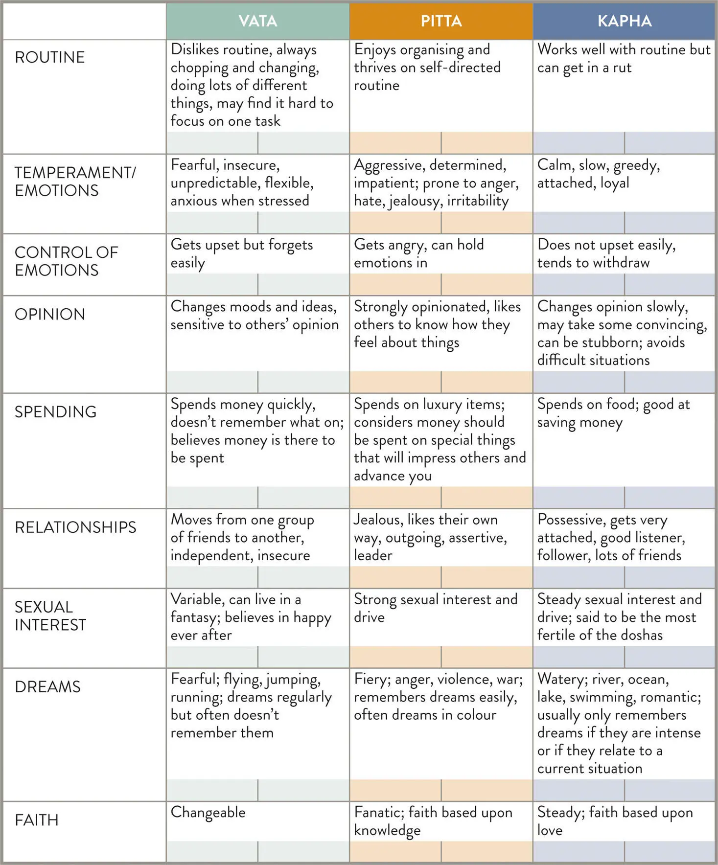 Go through the charts and tick the boxes, then add up the ticks. The one you have the most ticks under is your dominant dosha, the next your secondary dosha.