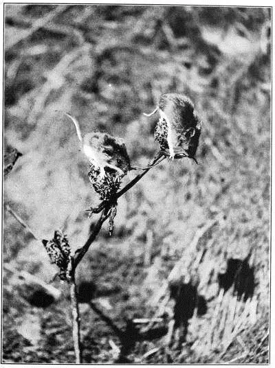 The last adventure of all was on the way home. We were walking along an abandoned railroad track, when suddenly a flock of light grayish birds flew up all together out of the dry grass and lighted in a small elm tree nearby. As we watched them, they turned and all flew down together. Instantly it was as if a mass of peach-blossoms had been spilled on the withered grass and white snow. Fully a third of the flock had crimson crowns and rose-colored breasts, while at the base of the streaked gray-and-brown backs showed a tinge of pink. It was our first flock of the lesser redpolls all the way down from the Arctic Circle. They were restless but not shy, and sometimes we were able to get within six feet of them. They would continually fly back and forth from the tree to the ground, keeping up a soft chattering interspersed with little tinkling notes, somewhat resembling the goldfinch or the siskin which we had left behind us in the swamp. Always, when they flew, they gave a little piping call, and their field-mark was a black patch under the throat which could be seen even farther than their red polls or their rosy breasts. Their beaks were light and very pointed, and they had forked tails like the siskin.