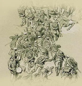 С нескольких сторон солдатам удалось закрепить лестницы, и они поднимались по ним на головокружительные высоты. Показавшихся над поверхностью горы встречали сабли, косы и надетые на палки штыки. Но следом поднимались другие, и не было им конца. Горцы стреляли по веревкам, на которых держались лестницы, но это не всегда помогало. Тогда оставалось последнее средство – бросаться на них сверху, чтобы перерубить веревки. Смельчаки находились, но не каждому удавалось сбить на лету лестницу. Одну из лестниц попытался сбить раненый мюрид, но его сабля наткнулась на апшеронца. Следом бросилась жена мюрида, но смогла лишь повредить лестницу. Тогда вниз ринулся их сын, сжимая в каждой руке по кинжалу. И лестница рухнула, унося в пропасть множество солдат и самого юношу.