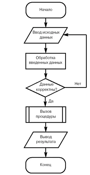 Со временем вычислительные задачи становились все сложнее, а значит, и решающие их программы увеличивались в размерах. Их разработка превратилась в серьезную проблему. Когда программа становится все больше, ее приходится разделять на все более мелкие фрагменты. Основой для такого разбиения как раз и стала процедурная декомпозиция, при которой отдельные части программы, или модули, представляли собой совокупность процедур для решения одной или нескольких задач. Одна из основных особенностей процедурного программирования заключается в том, что оно позволило создавать библиотеки подпрограмм (процедур), которые можно было бы использовать повторно в различных проектах или в рамках одного проекта. При процедурном подходе для визуального представления алгоритма выполнения программы применяется так называемая блок-схема . Соответствующая система графических обозначений была зафиксирована в ГОСТ 19.701-90. Пример блок-схемы изображен на рисунке (рис. 2.1).